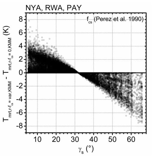 Figure 3 highlights the effect of circumsolar anisotropy in ED, fcs = variable, for determining Tmrt,r,KMM by comparing it with the case in which it is neglected, fcs = 0 [12]. In the extremes, Tmrt,r−fcs=var,KMM can deviate from Tmrt,r−fcs=0,KMM by approx. +5 (K) for solar altitudes γs close to the horizon and by approx. −7 (K) for the maximal γs of about 68 (degrees) within the data (due to SYNOPs only for 06 and 18 UTC at SBO (Table 1), higher solar elevations using modeled components are not attainable). Because the reference person is standing, the area projection factor fp for unidirectional SW irradiance increases with decreasing γs (Figure 1) and provides evidence for the positive deviations. For a given γs, the scattering in the differences arises from variable cloudiness due to the decreasing anisotropy effect with increasing cloud levels. At γs ≈ 32 (degrees), the optical air mass for the direct solar beam equals the mean value of the isotropic diffuse fraction and, thus, the anisotropic part in ED contributes to Tmrt,r,KMM by the same amount as if it were treated as isotropic. Because the optical air mass decreases in proportion to the increasing γs, there is a lower probability of the direct solar beam being scattered in its transfer to the earth’s surface. Hence, for high γs the differences tend towards a higher absolute value.