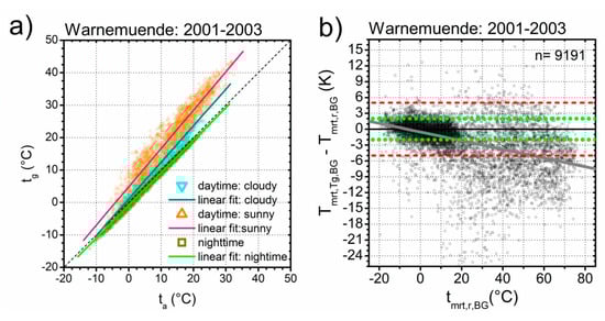 (a) Globe temperature tg versus air temperature ta, (b) difference Tmrt,Tg,BG (K) derived from measured tg of a black globe instrument (BG) minus Tmrt,r,BG (K) calculated from measured shortwave (SW) and longwave (LW) irradiation for the assumption of a black globe versus tmrt,r,BG (°C), where green dotted lines delimit the ISO comfort class ±2 (K) and red dashed lines the stress class ±5 (K).