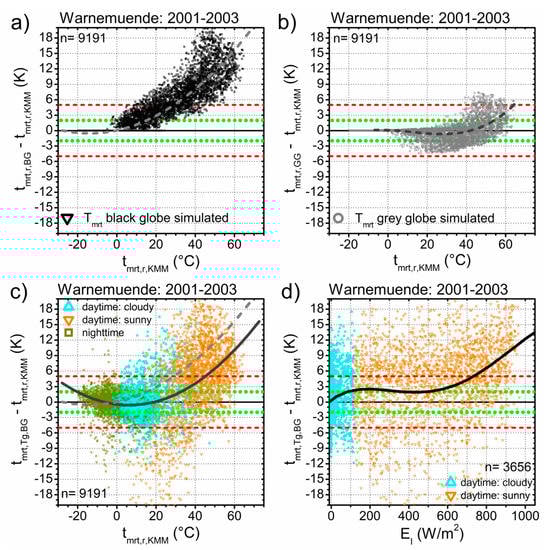 In an urban environment, standard active radiometry combined with Equation (3) can also be used in order to derive Tmrt for a human bioclimatological assessment. Deploying a sun tracker to measure EI or ED may be costly. An alternative could be to deploy a rotating shadow band irradiometer. After correction for its deviation from the Lambertian response and for its nonuniform spectral response, the instrument delivers both EG and ED in moderate to good quality, which allows EI to be inferred [71,72]. Furthermore, the input values for Equation (3) may be measured at roof level, i.e., without horizon limitations [33], or taken from a nearby meteorological site. Then, the derived Tmrt,r,KMM is valid for the sky fraction seen from the point of assessment, the sky view factor, and the observed radiation flux densities can serve as a force in modeling the radiation transfer within the complex urban environment [21,73,74,75]. The observations of irradiation at meteorological sites frequently do not include all the components required to derive Tmrt,r,KMM. It has been shown that it is possible to calculate it with the required accuracy for the ISO 7726 thermal stress class if EG and a synoptic observation are available to serve as the base in order to model the missing radiant components [30,76].