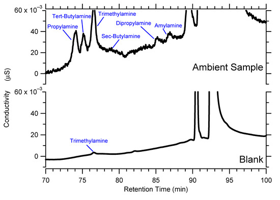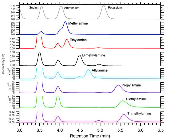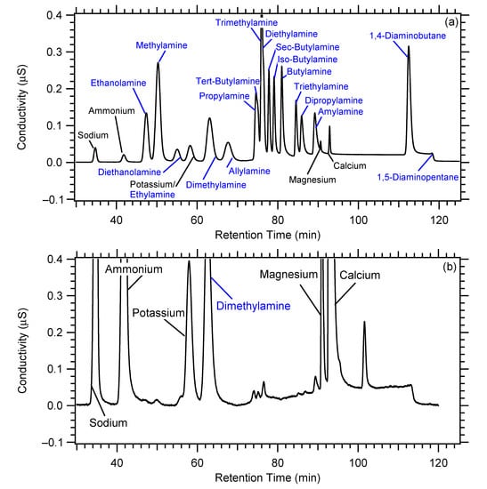 - VandenBoer, T.C.; Markovic, M.Z.; Petroff, A.; Czar, M.F.; Borduas, N.; Murphy, J.G. Ion chromatographic separation and quantification of alkyl methylamines and ethylamines in atmospheric gas and particulate matter using preconcentration and suppressed conductivity detection. J. Chromatogr. A 2012, 1252, 74–83. [Google Scholar] [CrossRef]