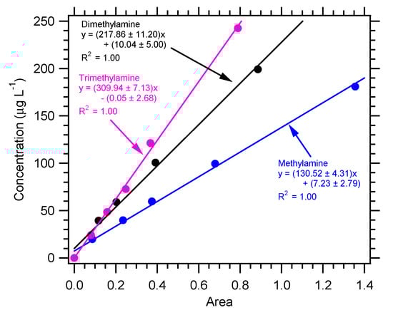 An example calibration chromatogram using the amine method described above is shown in Figure 3a. Good separation of the inorganic cations and amines was achieved. Overall, this method was able to quantify 18 different amines. This includes the whole series of methylamines and the isomers of butylamine. Calibrations were linear over the wide concentration range tested from 0–250 µg L−1. Example calibration curves for the series of methylamines are shown in Figure 4. Table S1 in the Supplementary Materials provides the equations for the calibration curves for the other amines. The method was sensitive with a limit of detection (LOD) for the various amines of 4 µg L−1. Assuming collection of a filter samples for 24 h at a flowrate of 10 LPM, this was approximately 1 ng m−3.