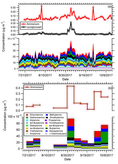 (a) Times series of levoglucosan, ammonium, and amines measured from daily filter samples collected at RMNP and (b) ammonium, and amines measured from weekly filter samples collected at Greeley, CO from 15 July to 15 October 2017.