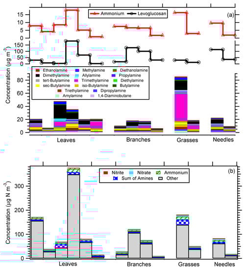 A set of biomass burning source filter samples from the controlled laboratory burns mentioned above was run using the amine method. Figure 7a shows contributions of the various amines in the biomass burning source samples as a function of fuel type. There appears to be variability in the distribution of amines among fuel types (leaves, branches, grasses, and needles). It is interesting to note that the most abundant amines in the biomass burning source samples were typically dimethylamine and/or trimethylamine, whereas in ambient samples ethanolamine, methylamine, diethanolamine, and dimethylamine dominated. Although most of these amines have been previously observed from biomass burning (and other sources), it appears differences in their contributions were observed between fresh and aged/transport smoke, as well as likely laboratory burns versus wildfire smoke, both of which require further investigation. The smoke marker levoglucosan followed the same pattern as the amines with the exception of the burn involving Kochia leaves. Levoglucosan itself correlated with ethanolamine, diethanolamine, tert-butylamine, triethylamine, and amylamine (R2 ranging from 0.51 to 0.76). Most of these amines were previously measured in the atmosphere but from sources other than biomass burning [], suggesting more work is needed to understand the speciation of amines across various sources. The biomass burning sample total nitrogen measurements allowed an estimate of the various nitrogen-containing species to be determined. Although the amines tracked the ammonium concentrations, the amines often had a larger contribution than ammonium to the total nitrogen. Ammonium contributed, on average, 8% (range 2–14%) to total nitrogen. The sum of amines was 11% (range 3–37%) and nitrate was 6% (range 1–16%). Other presumably organic species dominated the total nitrogen budget (Figure 7b). This suggests that although biomass burning was likely a source of amines, it might be relatively minor in regions heavily impacted by other sources, such as agricultural activities.
