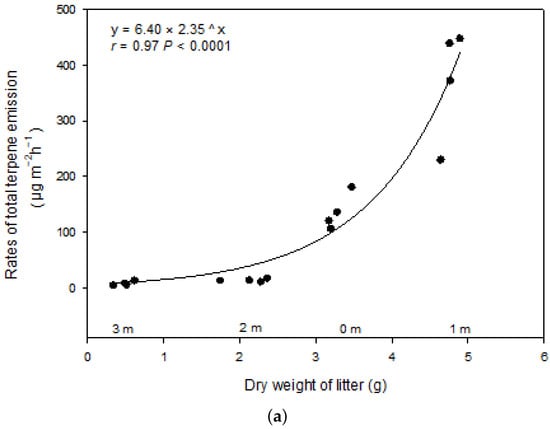 The litter dry weight was largest at 1 m (4.768 g), followed by 0 m (3.282 g), 2 m (2.128 g) and 3 m (0.492 g), and it showed strong exponential relationship with terpene emission (Figure 4a). The detected compounds were correlated positively with soil temperature and negatively with soil moisture content and distance to the tree (Figure 4b).