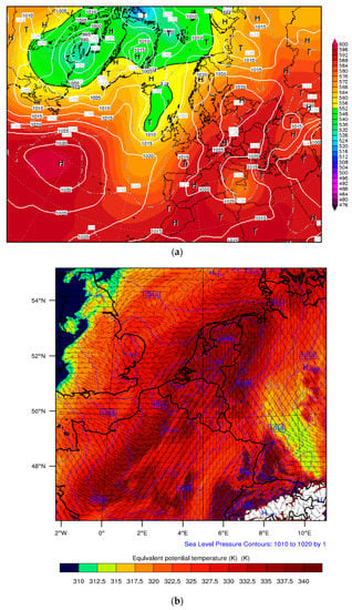 On 23 June 2016, the storm was at its highest intensity over Noord-Brabant, more precisely over Luyksgestel (See Figure 1 for key locations in this study) at around 18:45 UTC. During that day, a trough and low-pressure system were located over the North Sea area (Figure 2a), with relatively low potential temperatures at 850 hPa (≈4 °C) and a thin 500–1000 hPa layer (≈548 gpdam). A ridge and high-pressure system were located over continental Europe, with high potential temperatures at 850 hPa (≈22 °C in Germany) and a thick 500–1000 hPa layer (≈572 gpdam). A steep potential temperature and geopotential gradient extended from Spain to Denmark. Focusing on the region around the Netherlands (Figure 2b), we find the equivalent potential temperature had a maximum over North of the Netherlands, and in a band from southwest Belgium towards France. This pattern underlines the unstable environment that is favourable for storm formation. The wind patterns indicate convergence lines, for example, over Northwest Germany and in this band from southwest Belgium towards France. Over the UK, a classical cold front is present that separates the warm continental air from the colder maritime air.