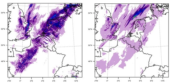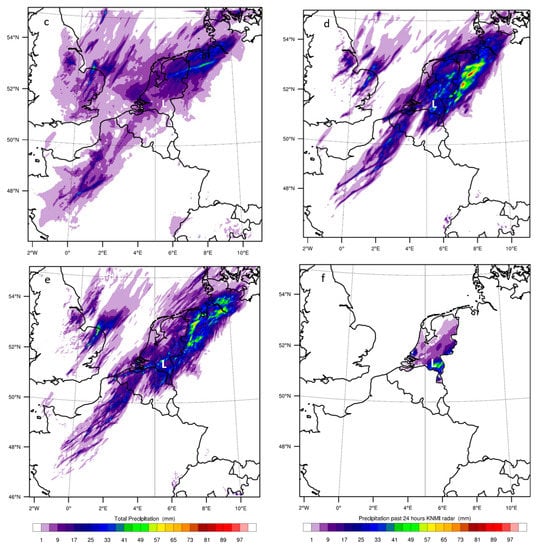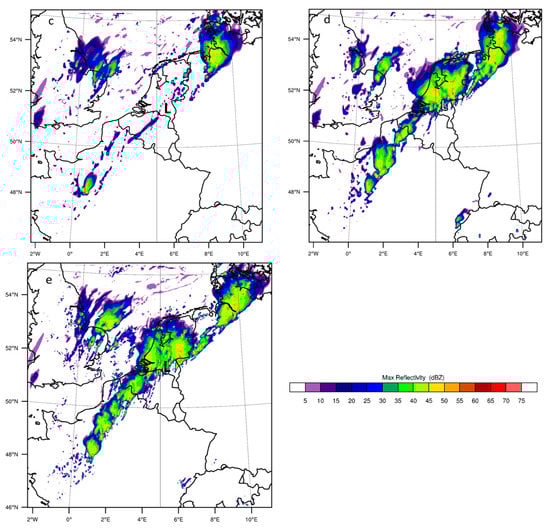 Figure 3 shows the modelled accumulated rainfall over the Netherlands between 23 June 2016 14:00 UTC and 24 June 2016 0:00 UTC of the explicit experiments (Figure 3d,e) and of the three experiments with CPS (Figure 3a–c). Figure 3f depicts the accumulated rainfall from over the same period as observed by the Dutch weather radar product. The zone of intense precipitation under study developed over the northwest of France and the English Channel. Around 16:00 UTC, the convection was strengthened and the system crossed at 17:30 UTC the southern Dutch border. The following 9.5 h precipitation continued over Noord-Brabant. The peak of the storm was at around 18:45 UTC.