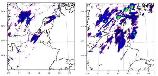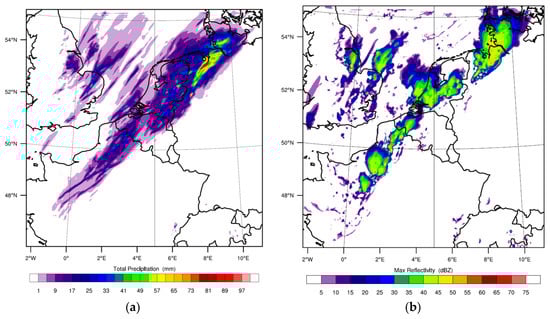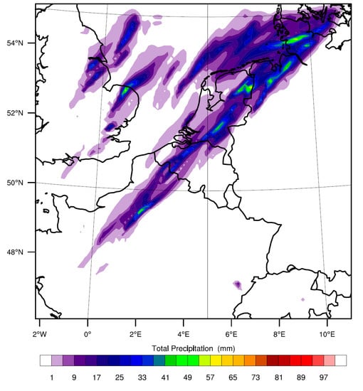 To verify the model results, 5-min rainfall observations from the KNMI (Koninklijk Nederlands Meteorologisch Instituut) Doppler radar were used, which we have accumulated from 23 June 14:00 UTC till 24 June 00:00 UTC. This radar product was calibrated based on 325 ground-based KNMI-weather stations and has a spatial resolution of 1 km2 [,]. The ground-based observations are of high accuracy, though the network density might be insufficient to capture very local, intense showers []. The model period ranges from 00:00 UTC till 00:00 UTC, but since we are interested only in the weather system that develops after 14.00 UTC, we compare model results and observations only for that period.