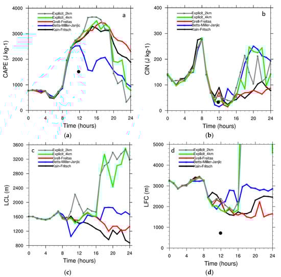 Modelled time evolution of (a) Convective Available Potential Energy (CAPE) (J kg−1), (b) Convective Inhibition (CIN) (J kg−1), (c) Lifting Condensation Level (LCL) (m) and (d) Level of Free Convection (LFC) (m) for Kain–Fritsch; Betts–Miller–Janjic; Grell–Freitas, explicit 4 km and explicit 2 km configurations for the location Eindhoven. The black dot indicates the observed CAPE value from the 12 UTC sounding.