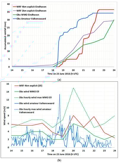 Modelled and observed accumulated rainfall (a), wind speed and maximum wind speed (b) over southwest Noord-Brabant The Netherlands. Precipitation observations originate from the WMO station Eindhoven and an amateur weather station in Valkenswaard. Wind speed observations originate from the WMO station Ell and an amateur weather station in Valkenswaard.