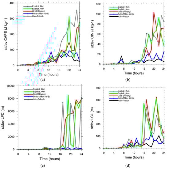 Figure 7 shows the model results addressing the spatial variability of soil moisture in order to study whether the different convection schemes scale this variability in soil moisture up to variability in convective activity in a different manner. Here, the variability is expressed as the standard deviation over the 10 members in an area of 76 × 112 km around Luyksgestel (Figure 1). Note that for each of the convection schemes, the 10 members are generated with the same soil moisture fields, which are simply generated by redistributing the existing soil moisture values over land through the model domain. We find clearly an increase in variability in time, but substantial differences in variability occurs between schemes. Concerning CAPE and CIN we find that the KF and BMJ schemes generate a rather small standard deviation compared to the other schemes (Figure 7a,b). The explicit schemes generate the highest variability, which is reasonably well followed by the GF scheme. As such, we may say that GF behaves in best agreement with the results of resolved convection, which might be explained by the scale-awareness of the scheme. Considering the LFC and the LCL, we find a similar grouping of schemes, where explicit convection and GF create high LFC and LCL variability, while LFC and LCL are more smooth in BMJ and KF, and therefore appear not to be effective in upscaling uncertainties in soil moisture. However, the signal is more noisy from time step to time step. In general, we conclude that the soil-moisture induced model uncertainty provides the widest variability using the resolved convection approach.
