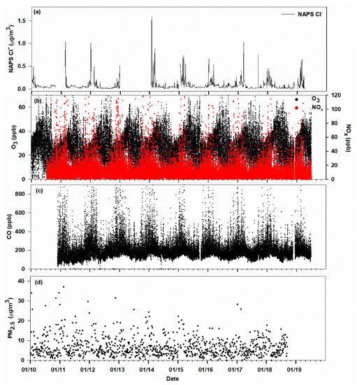 National Air Pollution Surveillance Program (NAPS) data showing 10-year trends for (a) Cl− from PM2.5 integrated measurements, (b) O3 and NOx hourly averages, (c) CO hourly averages, and (d) PM2.5 3-day integrated sampling measurements. The NAPS site location changed in 2016.