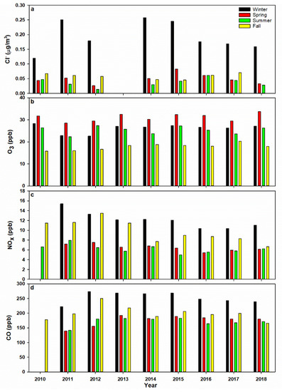 NAPS data showing seasonal (a) Cl− averages from PM2.5 particles, (b) O3 averages, (c) NOx averages, and (d) CO averages from 2010 to 2018. Winter is counted from December to March, Spring is counted from March–June, Summer is counted from June to September, and Fall is counted from September to December. The winter for a given year is including the December period from the end of the previous year. For example, winter in 2012 is including December 2011. The NAPS site location changed in 2016.