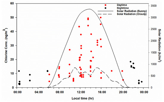Diurnal time series of measured photolabile chlorine concentrations taken during July 2017, May–June 2018, and March–April 2019 showing the 24-h trend observed, indicating the photolysis of halogenated compounds from sunlight exposure. Recorded solar radiation from a sunny day (12 June 2018) and an overcast day (14 June 2018) in Montreal are shown for reference.