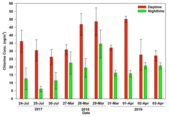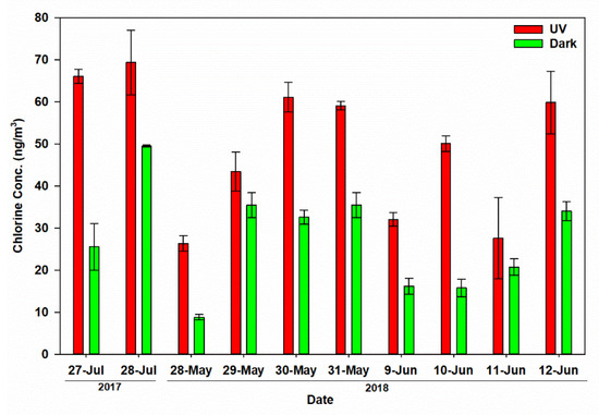 Air samples were taken during a discontinuous period from March 2017 to May 2019, primarily from May 2018–August 2018 and December 2019–April 2019. These samples were taken to assess the usability of the particle-based sorbent method for use on environmental atmospheric samples. To evaluate the daily photochemical variation affecting photolabile concentration, we have taken samples at various times throughout the day and night. The results of these tests showed the total effect of pollution from daily activity, as well as solar radiation on the Cl2 concentrations detected. Blank runs were performed by passing dry compressed air through the system and measuring any small amount of residual chlorine collected on the tubing and Cl2-RPGE tubes, which was not significant.