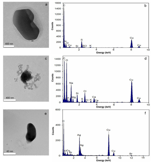 Electron microscopy images with energy-dispersive X-ray spectroscopy (EDS) of particles collected from loaded Cl2-RPGE (Cl2 Reactive Phase Gas Extraction) tubes. (a,b) Demonstrate Cl on a rigid particle, (c,d) Indicate possible presence of calcium carbonate with Cl present, and (e,f) Show the identification of Br presence. The Cu signals are due to the 400 mesh Cu grid used as a substrate.