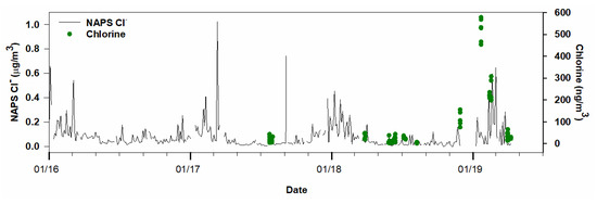Time series of NAPS data showing the 2016–2019 trend for Cl− from PM2.5 measurements, and the comparison with photolabile chlorine measurements during overlapped periods.