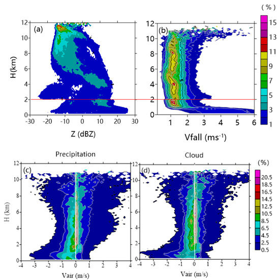 In the range of 2–4 km, stronger reflectivities (~10 dBZ) were observed. The clouds at this altitude should have comprised more orographic ice clouds compared with those at higher layers. These clouds generally could have stronger air uplifting motion (as represented in Figure 6c,d), and caused the growth of much larger ice particles. The Vfall of 1.0 m s−1 could correspond to the development of the solid particles with the diameter of 500–800 μm that could be regarded as the sixth type of ice particle shapes [35,36]. Indeed, the occurrence frequency of stronger Vair (namely, >1 m s−1) between 2 and 4 km steadily could increase, which caused greater LWC in 3–4 km. In addition, the layer of 0 °C was located approximately at the height of 1.5 km, and the maximum reflectivity in the liquid area was ~7 dB stronger than that of the solid area. A greater number of occurrences of air downdraft in liquid precipitation (between −2.0 and 0.5 m s−1) was due to the drag of liquid hydrometeors on air. Vfall corresponding to the ice particles over the top of the bright band increases after melting into liquid water (Figure 6b), which could be explained by different physical properties of hydrometeor particles (for example, density and shape). In addition, the sharp variations of reflectivity at the 2 km height appeared due to the higher sensitivity of the M2 mode at the minimum range of 2.1 km (marked with red line in Figure 6a,b). Most of the weak clouds were observed in the results generated by M2 compared with those obtained using M1 and M3.