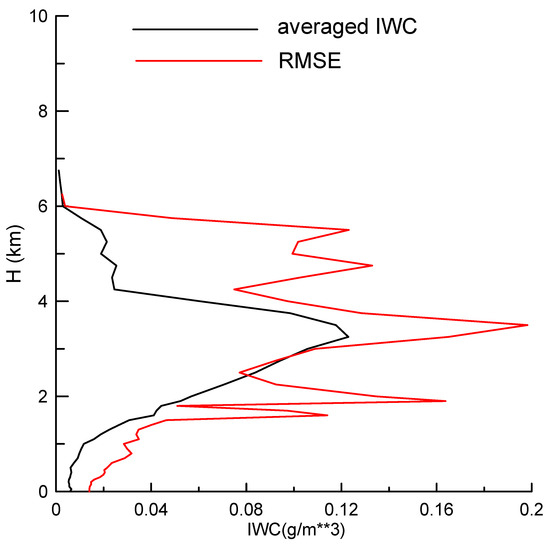 Averaged ice water content (IWC) and its root-mean-square error (RMSE) profiles obtained by the microwave radiometer.