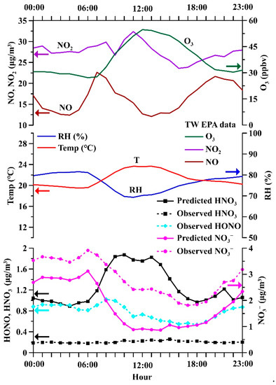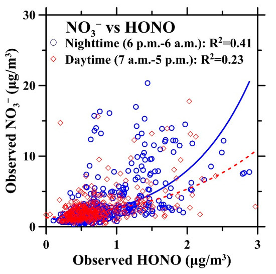 - Cui, L.; Li, R.; Zhang, Y.; Meng, Y.; Fu, H.; Chen, J. An observational study of nitrous acid (HONO) in Shanghai, China: The aerosol impact on HONO formation during the haze episodes. Sci. Total Environ. 2018, 630, 1057–1070. [Google Scholar] [CrossRef]