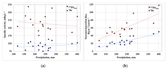 Dependence of specific activities (a) and seasonal deposition fluxes (b) of 7Be and 210Pbatm on the calculated amount of precipitation at the sampling points.