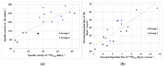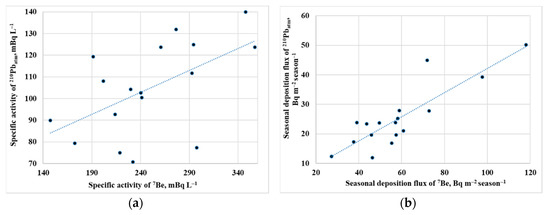 The study of the nature of the joint deposition of 7Be and 210Pbatm (Figure 3) shows a noticeable correlation (the Pearson correlation coefficient, r = 0.55) between the values of their specific activities. There is a strong correlation between the seasonal deposition fluxes of 7Be and 210Pbatm (r = 0.86). This suggests that the deposition of both radionuclides is regulated by the same processes (cloud height, the extent and duration of snowfall, the intensity of snowfall, cloud type and the vertical mixing of the air masses at the sampling location) [15,38,39].