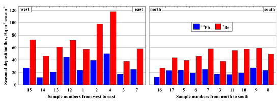 The spatial distribution of 7Be and 210Pbatm seasonal deposition fluxes at the sampling points is shown in Figure 4. It should be noted that the seasonal deposition fluxes of both 7Be and 210Pbatm in the latitudinal direction are generally higher than in the meridional direction. The seasonal deposition fluxes of 7Be from north to south vary from 27.3 to 58.8 Bq m−2 season−1 and those of 210Pbatm vary from 12.4 to 27.9 Bq m−2 season−1, with average values of 47.3 and 21.0, respectively. In the direction from west to east, these values vary from 37.7 to 118.1 Bq m−2 season−1 (7Be) and from 12.1 to 50.1 Bq m−2 season−1 (210Pbatm), with average values of 69.0 and 29.1, respectively.