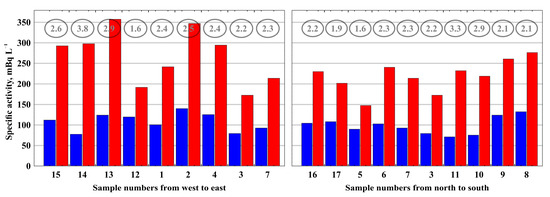 Figure 5 shows the spatial distribution of 7Be and 210Pbatm specific activities at the sampling points. The specific activity values of 7Be at the latitudinal direction sampling points (268 mBq L−1) are higher than the meridional (219 mBq L−1). The specific activities of 210Pbatm in both directions have close values (108 and 98 mBq L−1). The activity ratio of 7Be/210Pbatm varies from 1.6 to 3.8, with average values of 2.5 and 2.2.