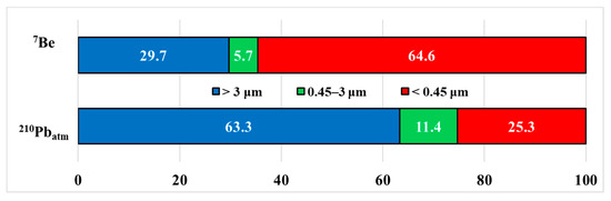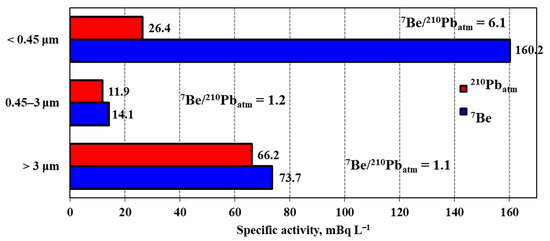 The average values of 7Be and 210Pbatm specific activities in the suspended matter in snow water particulate fractions, calculated over the entire set of studied samples, are presented in Figure 7. The fraction >3 μm contains 73.7 mBq L−1 (7Be) and 66.2 mBq L−1 (210Pbatm). Values of the 0.45–3 μm fraction are equal to 14.1 and 11.9 mBq L−1, and those of the <0.45 μm fraction are equal to 160.2 and 26.4 mBq L−1.