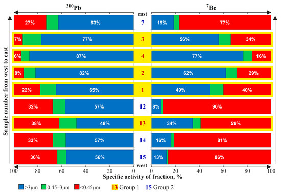 Figure 9 shows histograms characterizing the contribution of the particulate fractions of suspended matter in snow water to 210Pbatm and 7Be total activity in snow samples taken in the latitudinal direction from west to east. Two groups of points are distinguished by the contribution of coarse-grained fraction 1 (>3 μm) to the total activity of 7Be. The first group (Group 1) includes samples numbered 1–4 and 13, where the part of Fraction 1 is greater than 34%. The second group (Group 2) includes samples numbered 7, 12, 14 and 15, with a lower (<19%) contribution of this fraction. At the same time, the main part (48–87%) of 210Pbatm of all samples is concentrated in Fraction 1.