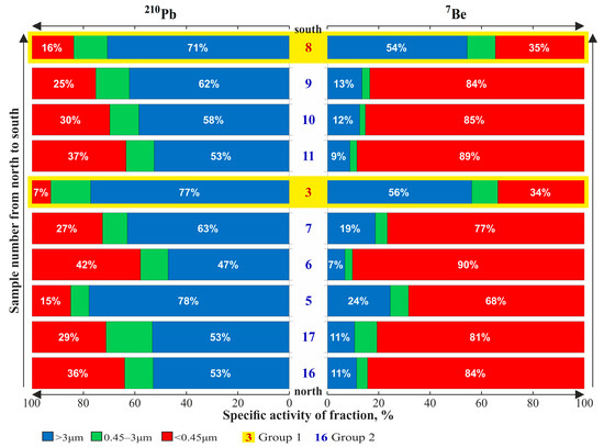 According to the same criterion (Figure 10), among the samples taken in the meridional direction (from north to south), Group 1 includes Samples 3 and 8, in which the contribution of the coarse-grained Fraction 1 of the suspended matter in snow water to 7Be total activity is equal to 54–56%. In the remaining samples (Group 2), 68–90% of the 7Be is concentrated in the finely dispersed Fraction 3 (<0.45 µm). In all samples, the main part (47–77%) of 210Pbatm is concentrated in the coarse-grained Fractions 1 and 2.
