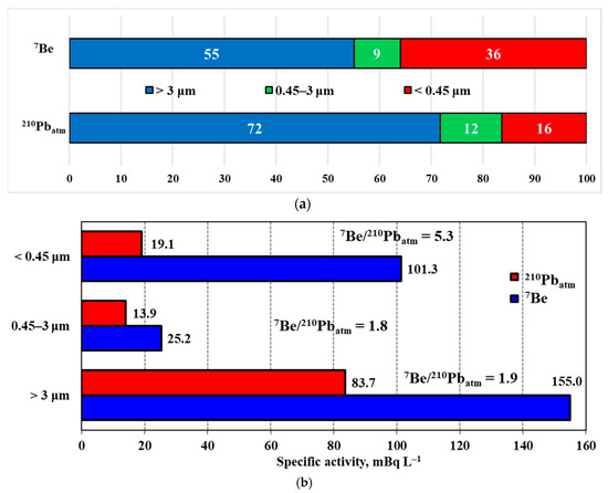 - The main part of 210Pbatm in all studied samples is the coarse-grained fraction and varies in the range of 47.0–87.1%, with an average value of 63.3%. The contribution of this fraction to the 7Be total activity is lower (6.7–76.7%, with an average value of 29.7%).