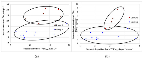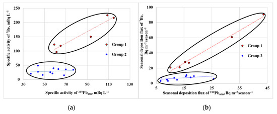 The division of the studied samples into groups according to the territorial location of their sampling sites can be clearly seen in the scatter diagrams constructed in the coordinates of the 7Be and 210Pbatm activities. Figure 13 shows the scatter diagrams of 7Be and 210Pbatm in specific activities and seasonal deposition fluxes for the coarse-grained Fraction 1 of the suspended matter in snow water. On both graphs, two areas of points are clearly distinguished, corresponding to the Group 1 and Group 2. In the samples of Group 1, a strong correlation was observed both between specific activities (r = 0.95) and between the seasonal deposition fluxes (r = 0.99) of 7Be and 210Pbatm. Correlations in Group 2, despite a noticeable linear trend in the distribution of points on the scatter-plots, are much lower. The correlation coefficient of specific activities is only 0.13. The correlation of seasonal deposition fluxes is more significant (r = 0.45). If we consider the entire set of points, including both groups, as a whole, then the correlation between 7Be and 210Pbatm in both specific activities and seasonal deposition fluxes is very high at r = 0.82 and r = 0.85, respectively.