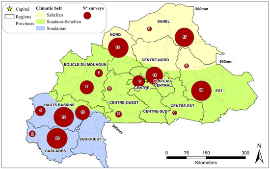 Spatial distribution of surveys along the different agroclimatic zones (Sahelian, Soudano-Sahelian, and Soudanian).