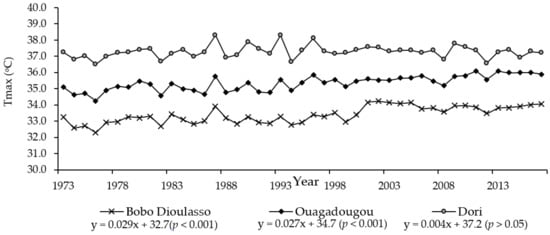 Mean annual maximum temperature (Tmax), lineal regression, and statistical significance along the different agroclimatic zones (Soudanian, Soudano-Sahelian, and Sahelian) for the period 1973–2017.