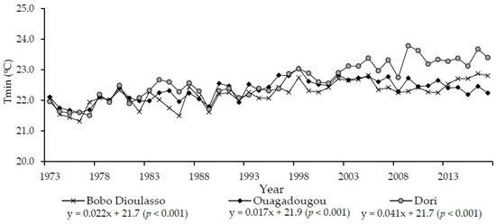 Mean annual minimum temperature (Tmin), lineal regression, and statistical significance along the different agroclimatic zones (Soudanian, Soudano-Sahelian, and Sahelian) for the period 1973–2017.