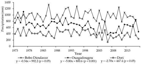 Total annual precipitation (mm), lineal regression, and statistical significance along the different agroclimatic zones (Soudanian, Soudano-Sahelian, and Sahelian) for the period 1973–2017.