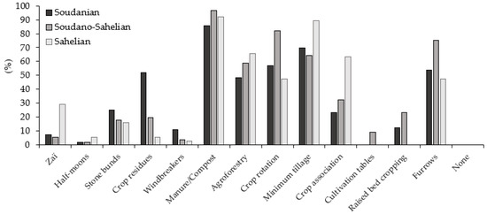 Almost all farmers affirmed adopting agroecological practices to absorb climate impacts and risks across the country (Figure 5 and Figure 6). The role of indigenous and traditional knowledge on ecosystem-based adaptation was reflected in farmers´ responses. The most frequently applied strategies across the country included the application of organic matter (91%), followed by minimum tillage (75%), crop rotation (62%), agroforestry, and the use of furrows (both with 58%). Such strategies had in common the conservation of soil carbon, reduction of losses from direct evaporation, and preservation of soil nutrients. However, the number of farmers embracing environment conservation strategies differed between regions. For example, Sahelian smallholder farmers widely used, when compared to the Soudanian zone, traditional farming systems to adapt to climate shocks and reduce agrochemical impacts over the environment. This was estimated based on the number of respondents in the Sahel applying organic matter (92%), zero or minimum tilling (89%), adopting agroforestry systems (66%), associating crops (63%), or using zaï pit systems (29%).
