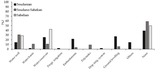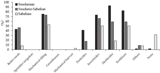Furthermore, the use of water conservation strategies, including infrastructures for storing water, was relatively low due to the low purchasing power of farmers across the country, particularly of smallholder farmers in the Sahel (Figure 6). In fact, 49% of the farmers across the country acknowledged having no means to procure water conservation and/or irrigation infrastructures in their fields. The most prevalent strategy noted was shared water resources from reservoirs and water wells (26% and 24%, respectively). The use of technological solutions, such as ground levelling and embankments, were generally embraced by large-scale rice and maize farmers located in the Soudanian zone (27% and 21%, respectively). In addition, the use and type of plant growth regulators (e.g., herbicides) and growth promoters (e.g., fertilizers) were adopted differently across the country (Figure 7). Soudanian farmers widely used agrochemical herbicides (93%, e.g., Gliphader), synthetic fertilizers (82%, e.g., urea-CO(NH2), N, P, K, and phosphate-PO43-), as well as pesticides and insecticides (41% and 73%, respectively, e.g., Cypercal and Caiman Rouge); whereas Soudanian and Sahelian farmers, particularly the latter, used the previous products to a lesser extent (58% insecticides, 55% synthetic fertilizers, 39% herbicides, and 9% pesticides, on average). In addition, animal draught tillage was mainly afforded by large-scale farmers in the Soudanian and Soudano-Sahelian zones (74% on average), but fewer in the Sahel (53%). A similar pattern was observed for the use of performant seeds (e.g., drought tolerant maize genotypes), with 45% of the farmers having access to seeds in the Soudanian and Soudano-Sahelian zone, but very few in the Sahel (8%).