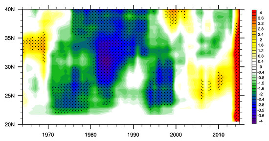 The time–latitude cross–section of the 7–year running mean of frequency of extreme high–temperature events (FEHE) anomalies (unit: 1) during summer relative to the climatic summer mean for 1961–2018 averaged over 105° E–120° E. The dots denote where the anomalies exceed one standard deviation.