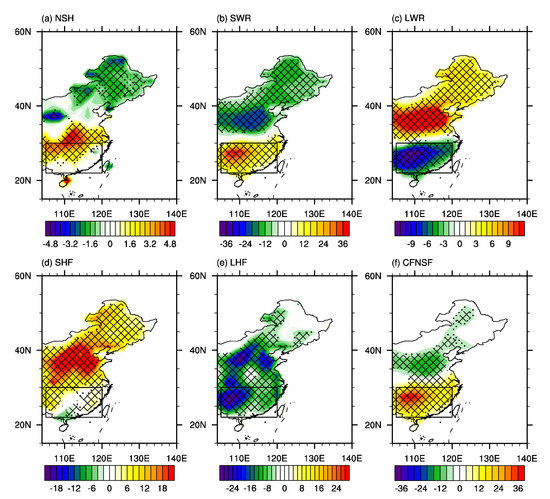 The differences in the summer mean (a) net surface flux (NSH), (b) surface net shortwave radiation (SWR), (c) surface net longwave radiation (LWR), (d) surface sensible heat net flux (SHF), (e) surface latent heat net flux (LHF), and (f) cloud forcing net solar flux (CFNSF) between P2 and P1 (P2 minus P1, unit: W m−2). The positive direction is defined as downward. Dots and meshes in (a–f) denote where the anomalies are significant at the 90% and 95% confidence levels based on Student’s t-test, respectively. The black rectangle in (a–f) refers to the domain of southern China.