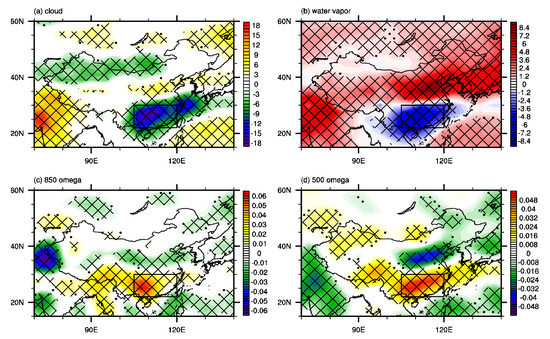 The cloud forcing net solar flux is closely related to the cloud amount. Sufficient water vapor and ascent motion would contribute to increased clouds and decreased solar fluxes reaching the surface. As shown in Figure 4, the decreased water vapor (Figure 4b) and anomalous descent motion (Figure 4c,d) over southern China contribute to the reduced cloud (Figure 4a), which leads to increased solar fluxes reaching the surface and favors the occurrence of EHEs over southern China.