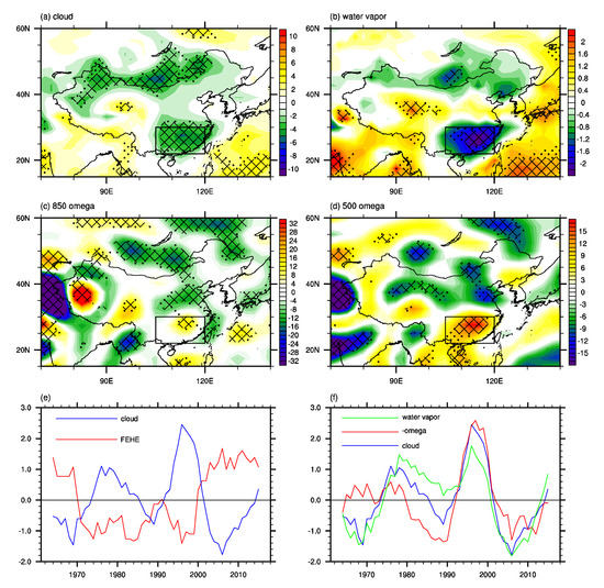 The differences in the summer mean (a) total cloud amount (unit: %), (b) atmospheric water vapor content (unit: kg m−2), (c) 850–hPa vertical velocity (unit: 10−3 Pa s−1), and (d) 500–hPa vertical velocity (unit: 10−3 Pa s−1) between P2 and P1 (P2 minus P1). (e) The standardized time series of the 7–year running mean of the regional FEHE over southern China (red) and summer mean total cloud amount (blue) averaged over southern China. (f) The standardized time series of the 7–year running mean of the summer mean total cloud amount (blue), atmospheric water vapor content (green) and sign-reversed 500–hPa vertical velocity (red) averaged over southern China. Dots and meshes in (a–d) denote where the anomalies are significant at the 90% and 95% confidence levels based on Student’s t-test, respectively. The black rectangle in (a–d) refers to the domain of southern China.