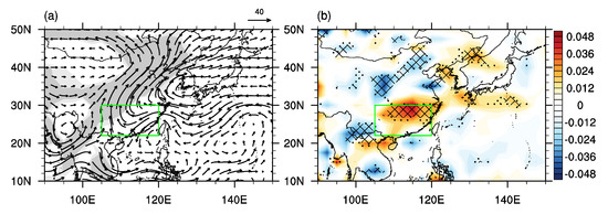 The differences in the summer mean (a) vertically integrated water vapor transport (vector, unit: kg m−1 s−1) and (b) divergence of the water vapor transport (unit: 10−3 kg m−2 s−1) between P2 and P1 (P2 minus P1). Light (dark) shadings in (a) and dots (meshes) in (b) denote where the anomalies are significant at the 90% (95%) confidence level based on Student’s t-test. The green rectangle in (a,b) refers to the domain of southern China.
