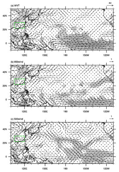 The differences in the summer mean (a) vertically integrated water vapor transport (vector, unit: kg m−1 s−1), (b) 850–hPa wind (vector, m s−1) and (c) 500–hPa wind (vector, m s−1) between P2 and P1 (P2 minus P1). Light (dark) shadings denote where the anomalies are significant at the 90% (95%) confidence level based on Student’s t-test. The green rectangle in (a–c) refers to the domain of southern China.