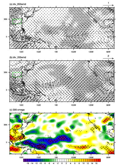 The differences in the summer mean (a) divergent components of 850 hPa wind (vector, unit: m s−1), (b) divergent components of 200 hPa wind (vector, unit: m s−1), and (c) 500 hPa vertical velocity (unit: 10−3 Pa s−1) between P2 and P1 (P2 minus P1). Light (dark) shadings in (a,b) and dots (meshes) in (c) denote where the anomalies are significant at the 90% (95%) confidence level based on Student’s t-test. The green rectangle in (a–c) refers to the domain of southern China.