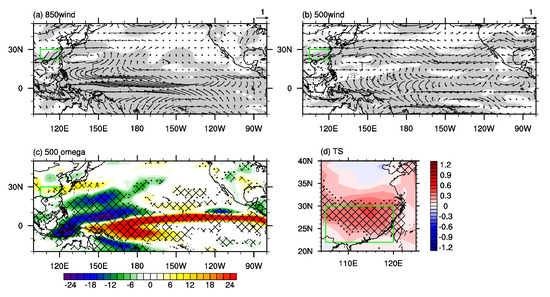 The differences in the summer mean (a) 850 hPa wind (m s−1), (b) 500 hPa wind (m s−1), (c) 500 hPa vertical velocity (10−3 Pa s−1), and (d) surface temperature (°C) between the sensitivity experiment and the control experiment of the CAM5 model (sensitivity minus control). Light (dark) shadings in (a,b) and dots (meshes) in (c,d) denote where the anomalies are significant at the 90% (95%) confidence level based on Student’s t-test. The green rectangle in (a–d) refers to the domain of southern China.
