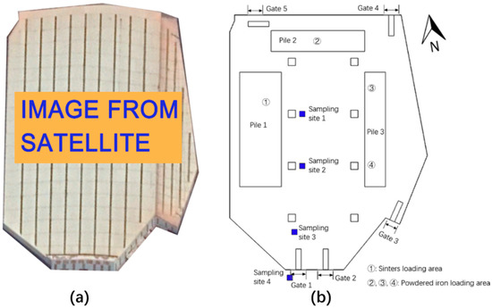 (a) Map of storage yard of iron and steel plant with accurate coordinate; (b) practical scenery of storage yard inside.