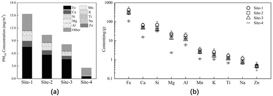 (a) Concentration of PM10 at each site; (b) element contents at each site.
