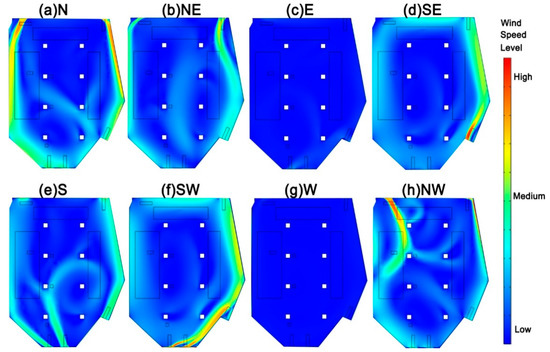 Wind field inside the enclosed yard under external wind from (a) north; (b) north-east; (c) east; (d) south-east; (e) south; (f) south-west; (g) west; (h) north-west.