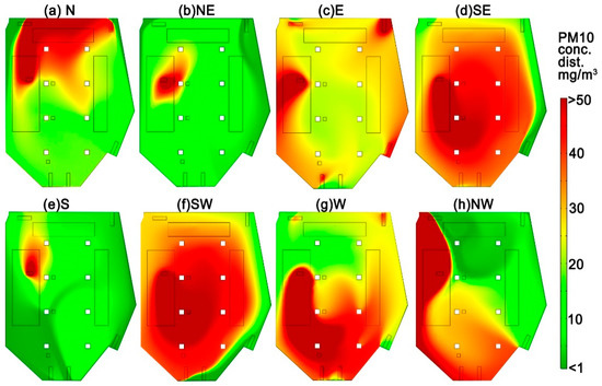 The PM10 concentration distribution at a wind speed of 6.7 m/s under different wind direction: (a) north; (b) north-east; (c) east; (d) south-east; (e) south; (f) south-west; (g) west; (h) north-west. (Different wind speed will lead to different PM10 concentration distribution in the enclosed yard, here only shows the result with a wind speed of 6.7 m/s.).